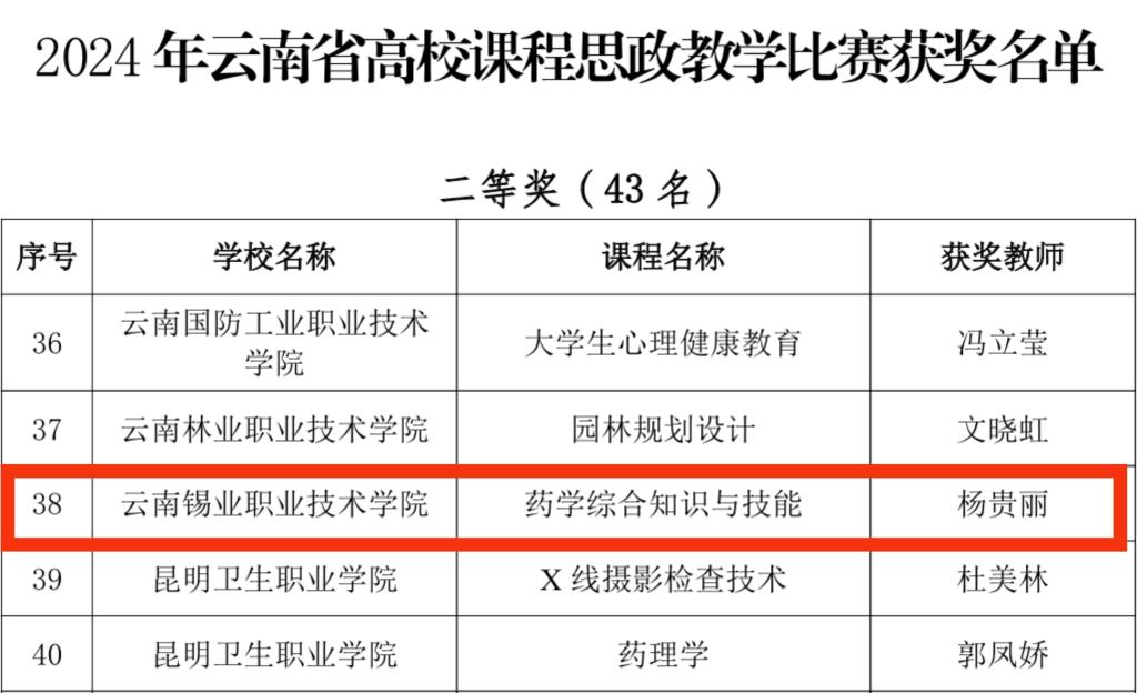 11月19日,2024年云南省高校课程思政教学比赛获奖名单公布,学院教师杨贵丽在比赛中脱颖而出,荣获二等奖。