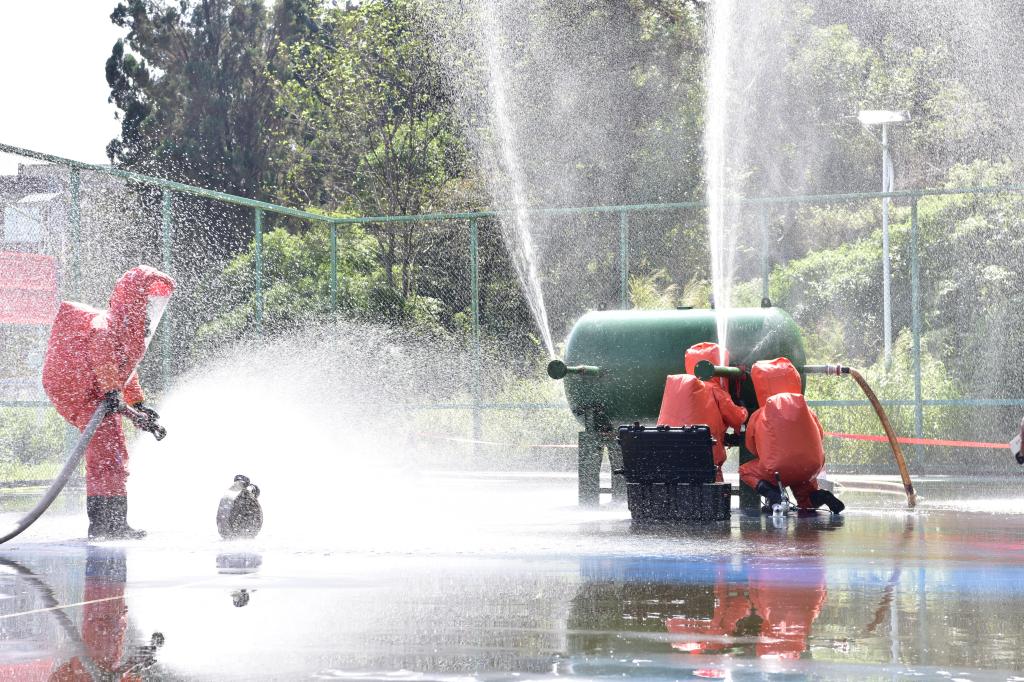 在危险化学品工艺管线泄漏处置项目中,选手临危不惧,迅速穿戴防护装备,准确找到泄漏点,有序进行紧急封堵,有效防止事故扩大和次生事故发生。