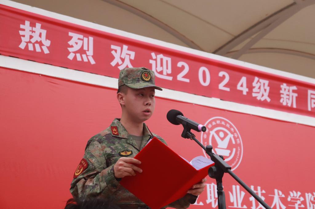 新生周倩代表24级全体新生承诺:一切行动听指挥,虚心学习,刻苦训练,严格遵守各项纪律,在军训中磨炼自我,以自信、自强、坚韧的精神风貌开启新阶段的学习生活。