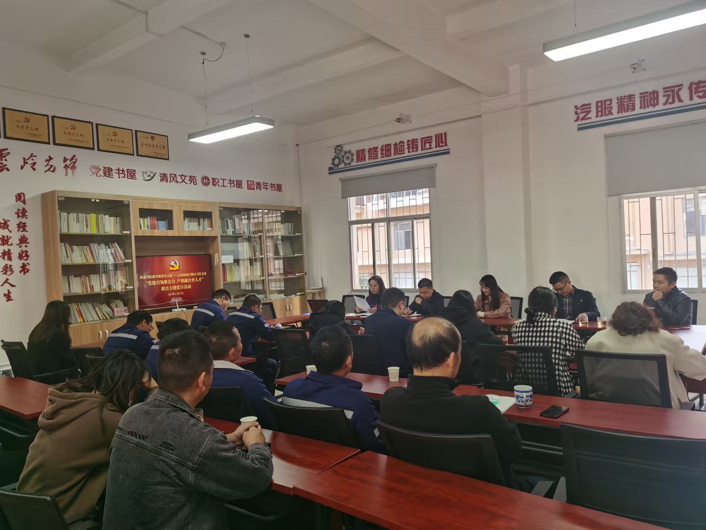 学院教学服务党支部党员还参观了汽服公司党员活动室、企业文化墙、职工书屋及厂区维修车间。