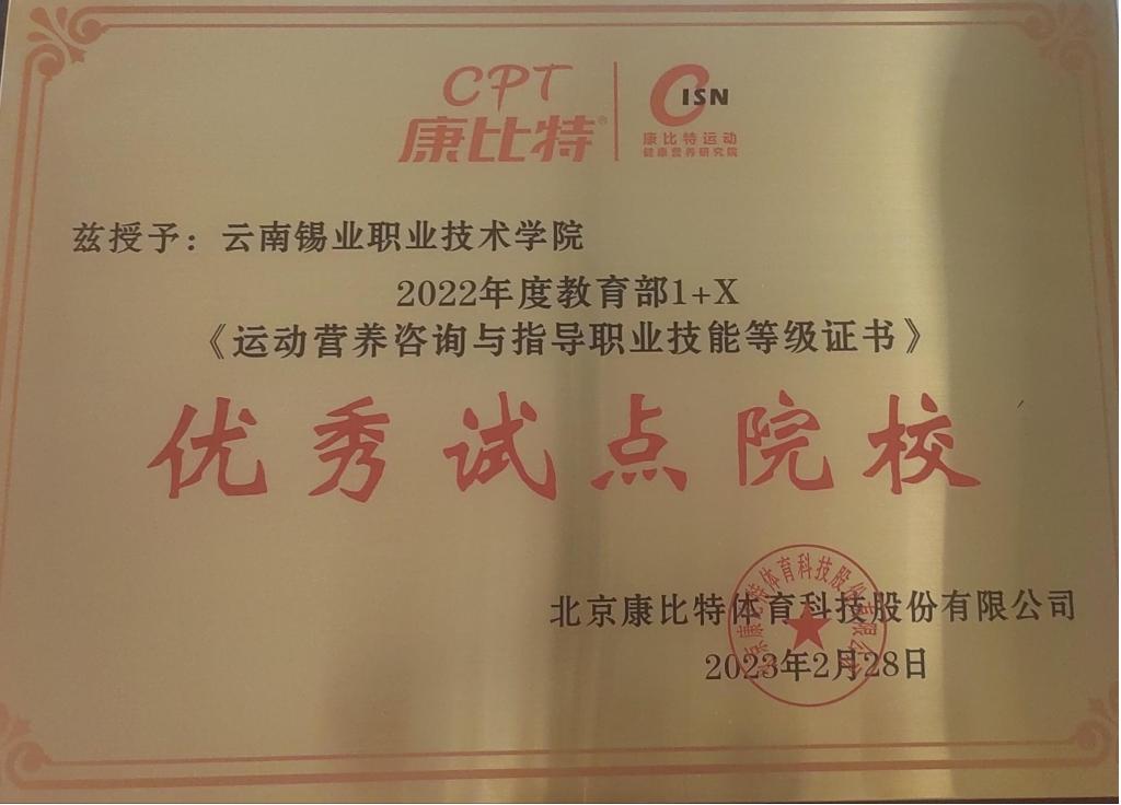 近日,北京康比特体育科技股份有限公司(该司是教育部职业技术教育中心研究确定的“运动营养咨询与指导职业技能等级证书”的培训评价组织)开展了2022 年度1+X运动营养咨询与指导职业技能等级证书试点工作优秀单位和个人评选,学院被评为“2022年度教育部1+X《运动营养咨询与指导职业技能等级证书》优秀试点院校”,资源与环境学院教师卜晶晶被评为“2022年度1+X运动营养咨询与指导职业技能等级证书试点工作优秀个人”。