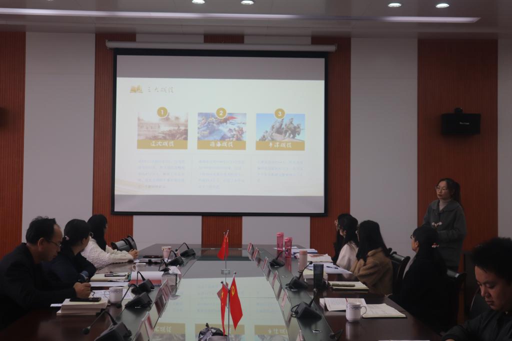 基础部优秀教师李玲晋领学了毛泽东主席诗词《七律·人民解放军占领南京》;部分优秀教育工作者、班主任、辅导员分别作了学习交流发言。