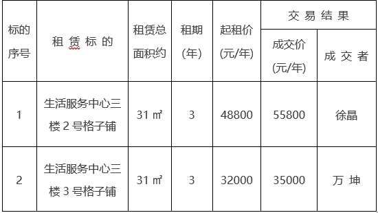 一、租赁标的交易结果:
