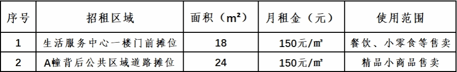 3.公开招租设每平方最低月租金(按月收取),竞租人从租赁底价开始竞价,加价幅度:序号1、序号2为20元/次,上不封顶。报价延时时间为2分钟,2分钟内无人再次竞价,以最高竞价者为承租人。