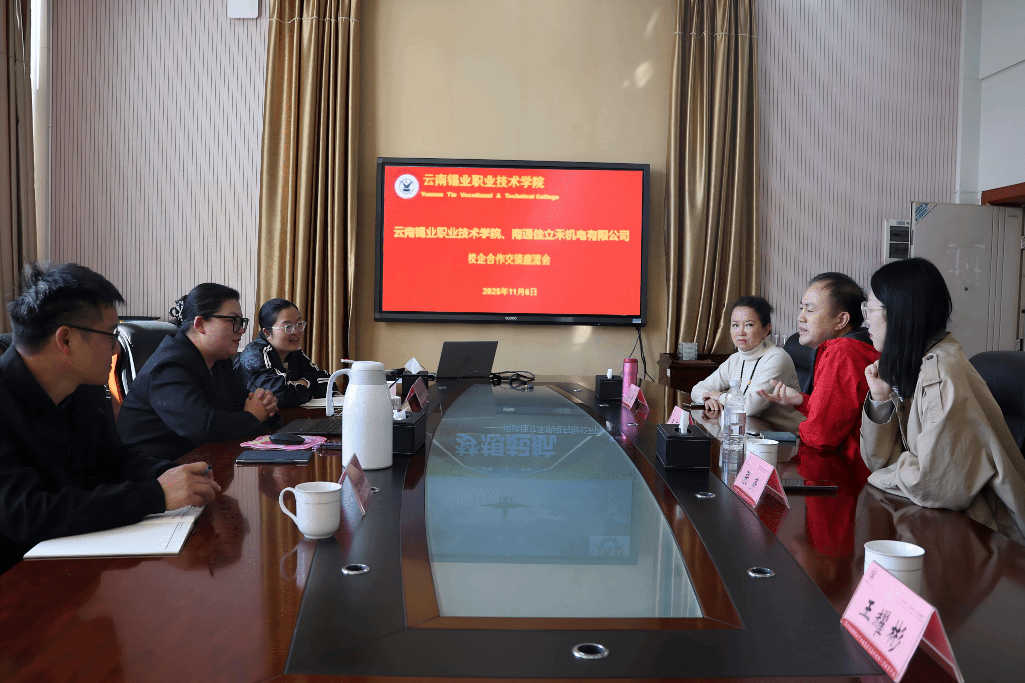 11月6日,南通佳立禾机电有限公司董事长王志龙一行到访学院,就人才培养、校企深度合作等事宜与学院党委副书记、院长李蕾座谈交流。