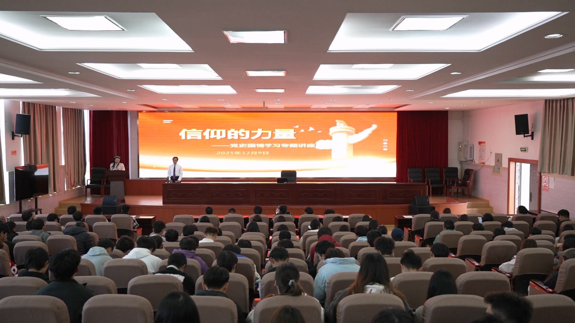 12月9日,学院在博学楼508报告厅开展“知行大讲堂”活动,特邀“银龄教师”何跃林为200余名青年学子讲授“信仰的力量”党史国情学习专题讲座。